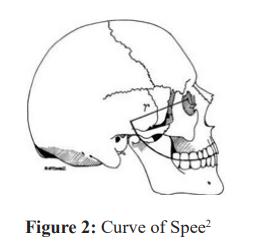 The curve of Spee (Figure 2) represents the anatomical curvature of the plane of occlusion, when viewed from the lateral aspect. It starts at the tip of the lower canine, tracing along the buccal cusp tips of the premolar and molar teeth, follows the anterior border of the ramus of mandible, and finally connects to the anterior most part of the mandibular condyle.6
