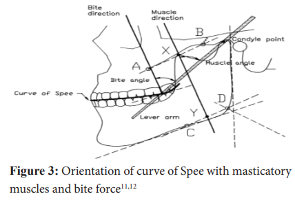 Peter E Dawson mentioned the curve of Spee as the anteroposterior curvature of the occlusal plane of the lower teeth. It commences at the cusp tip of lower canine and follows the tips of the buccal cusps of premolars and molars, continuing along the anterior border of the mandibular ramus until the anterior most portion of the mandibular condyle.9 According to Sicher, the formation of Spee’s curve results from the coincidence of the longitudinal axis of each individually attached and movable tooth with the direction of the resultant masticatory force at that point. This curved alignment redirects the downward biting force from jaw muscles into an angled force acting on each tooth (Figure 3). The resultant oblique force distribution reduces stress on individual teeth and supports their long-term health. The tilting of chewing forces on the molars in forward direction, together with their positional arrangement, plays a crucial role in creating the curved occlusal plane.10 Kleinberg further emphasized that the curve of Spee is necessary for enabling protrusive contact of the incisor teeth without causing interferences from the posterior teeth.11