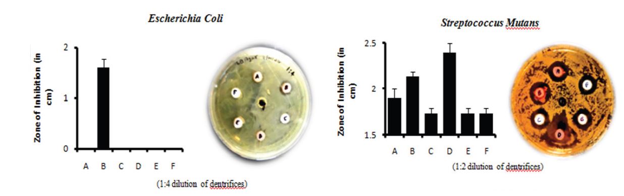 Method: The antimicrobial effectiveness of the chosen herbal toothpastes was assessed using agar diffusion assays by measuring zones of inhibition. Serial dilutions (1:2, 1:4, 1:8, 1:16) of each formulation were tested against pathogens such as Escherichia coli, Streptococcus mutans, and Candida albicans.